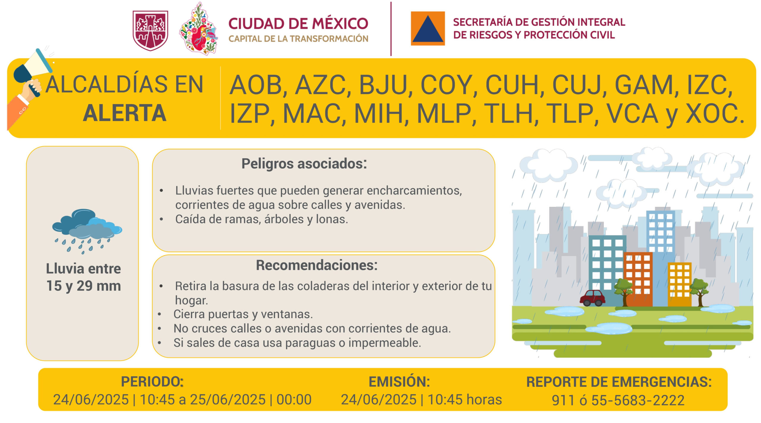 Ante cualquier emergencia, comunicarse a los teléfonos 911, al 555658 1111 de Locatel, y al 555683 2222 de la SGIRPC.Se pronostica lluvia de entre 15 y 29 milímetros entre las 10:45 y las 00:00 horas de este martes 24 de junio de 2025.
