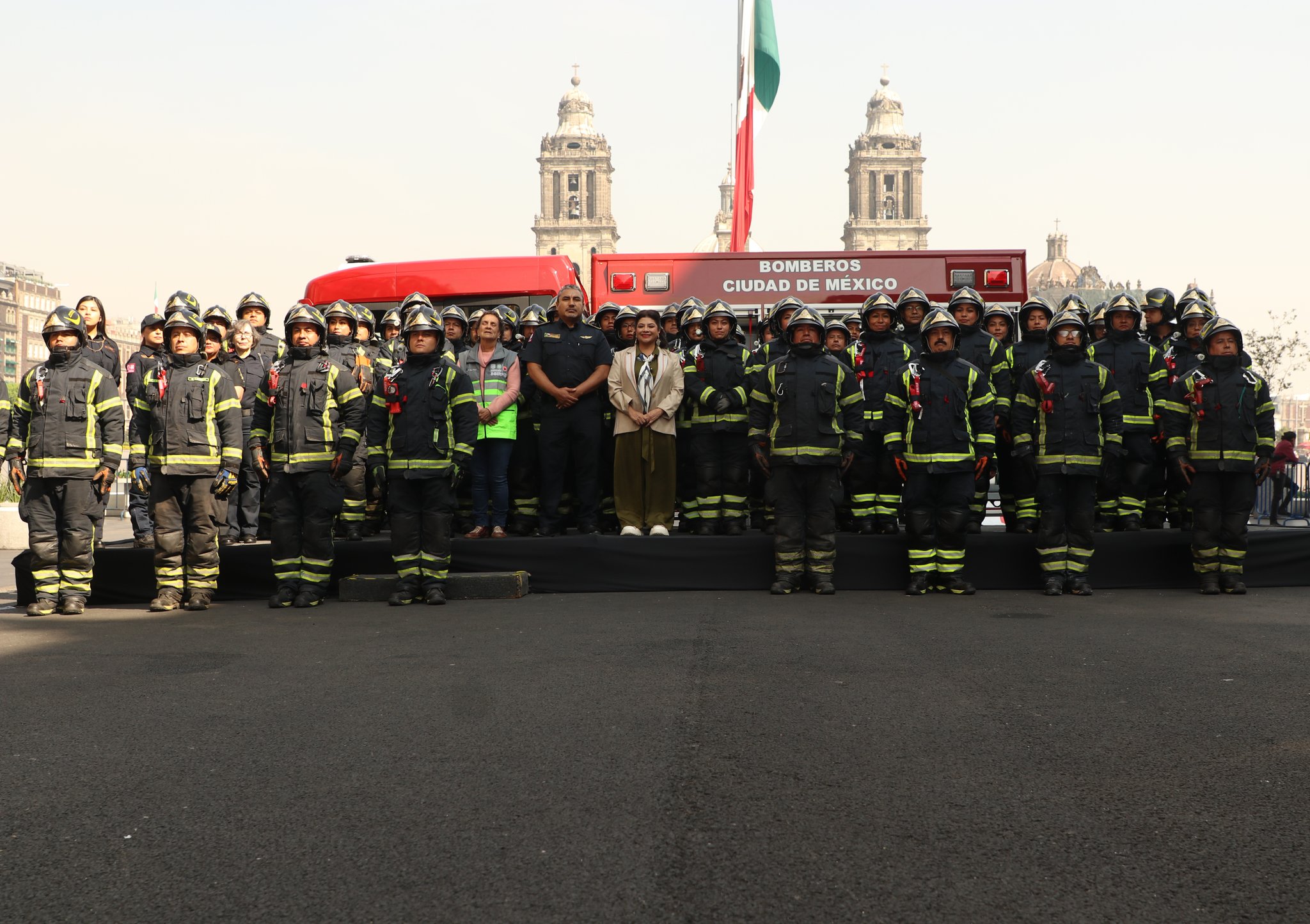 Al repicar de las sirenas, Clara Brugada hizo el anuncio que además de equipamiento y mejores condiciones de trabajo para el desempeño de las y los mil 800 bomberos de la capital, se construirán cuatro estaciones más de Bomberos.