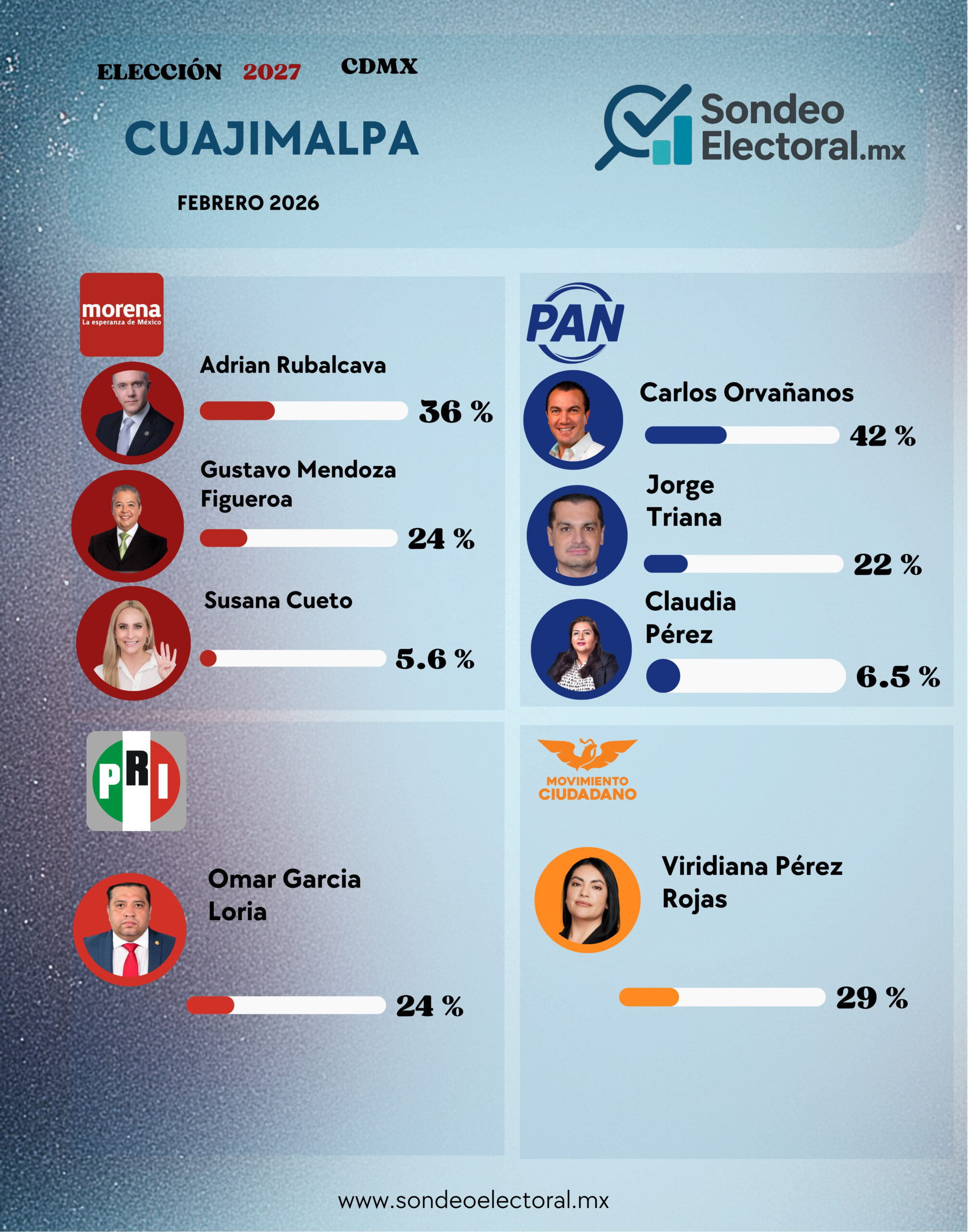 Del lado de Morena, el panorama es más complejo. Adrián Rubalcava lidera con 36%, pero con señales de estancamiento frente al crecimiento panista. La comparación con enero muestra que, aunque mantiene el primer lugar interno, no logra despegar con fuerza. Más atrás, Gustavo Mendoza Figueroa se ubica en 24%, consolidándose como segunda opción, mientras Susana Cueto permanece marginal con 5.6%, sin cambios relevantes.
