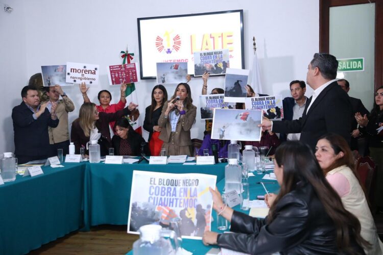 Lo que siguió fue un crescendo de tensión. Las legisladoras de Morena desplegaron pancartas acusando a Rojo de la Vega de haber financiado al “bloque negro” que participó en la marcha del 15 de noviembre. La acusación, con letras grandes y visibles para todo el pleno, provocó la inmediata reacción de la bancada panista, que respondió con mantas de contenido igual de incendiario. Los ánimos se quebraron: la presidenta Batres decretó recesos intermitentes, pero ni las pausas ni los llamados al orden restablecieron la calma.