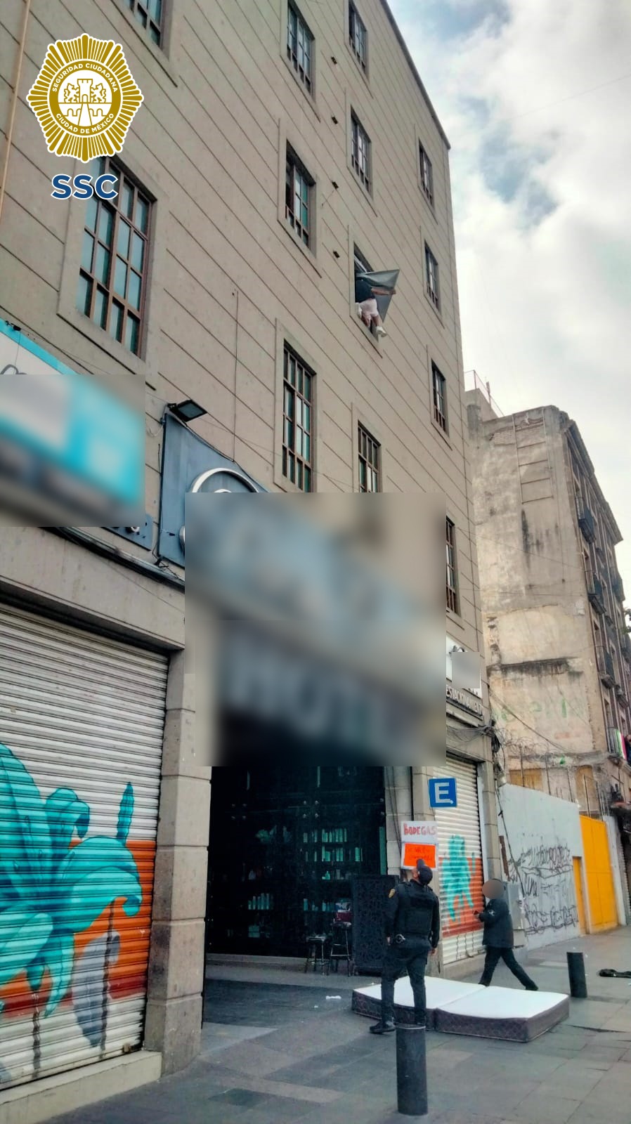 CDMX, 6 octubre 2025.- Un hombre puso a correr a policías y paramédicos de la SSC cuando, al estilo telenovela, intentó lanzarse desde la ventana de un hotel en pleno Centro Histórico, justo en la esquina de Pino Suárez y Regina.